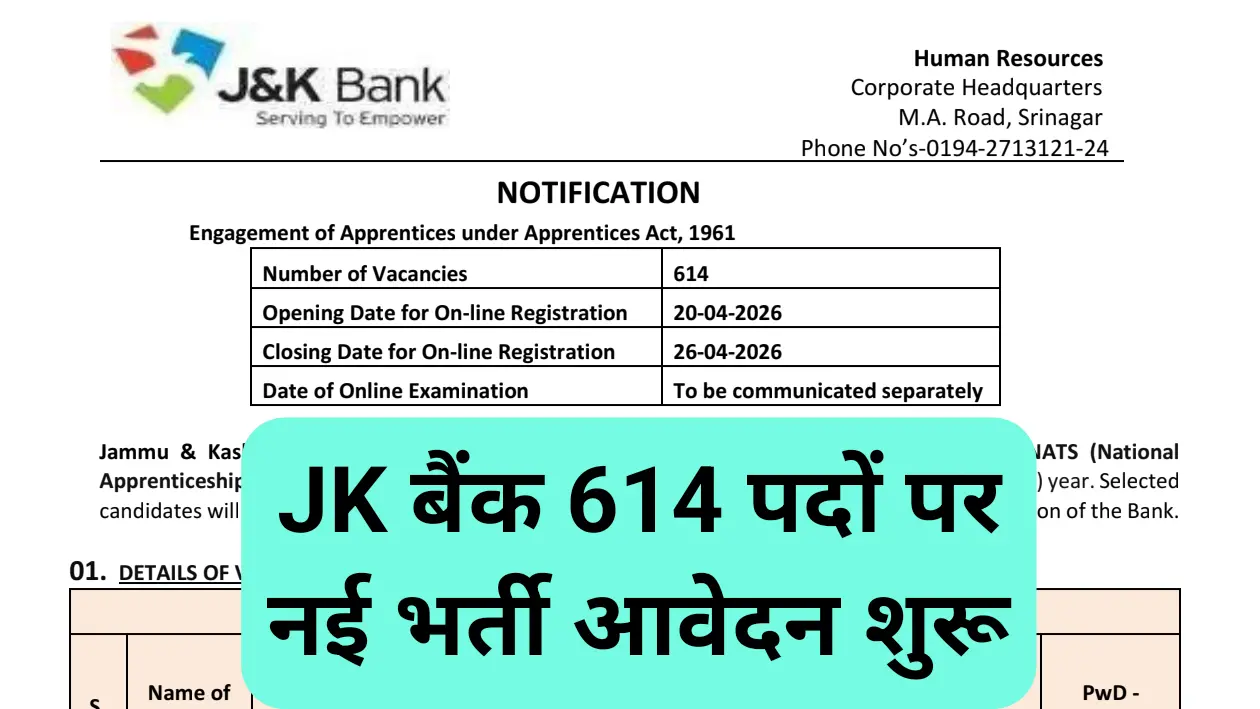 JK Bank Recruitment 2026: जम्मू और कश्मीर के बैंकिंग क्षेत्र में करियर बनाने का सपना देख रहे युवाओं के लिए एक उत्साहजनक खबर सामने आई है। क्षेत्रीय अर्थव्यवस्था की रीढ़ माने जाने वाले जम्मू और कश्मीर बैंक (JK Bank) ने ‘शिक्षु अधिनियम 1961’ के तहत वर्ष 2026 के लिए 614 अप्रेंटिस (Apprentice) पदों पर भर्ती की आधिकारिक अधिसूचना जारी कर दी है।