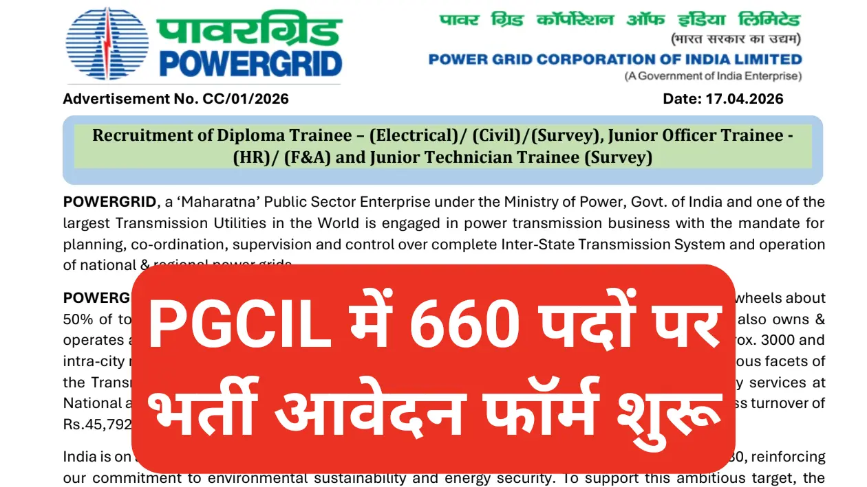 POWERGRID Recruitment 2026: भारत सरकार की ‘महारत्न’ कंपनी, पावर ग्रिड कॉर्पोरेशन ऑफ इंडिया लिमिटेड (POWERGRID) ने देश के ऊर्जा क्षेत्र में करियर बनाने के इच्छुक युवाओं के लिए एक बड़ी खुशखबरी साझा की है। पावर ग्रिड ने वर्ष 2026 के लिए जूनियर ऑफिसर ट्रेनी (JOT), डिप्लोमा ट्रेनी (DT) और जूनियर टेक्नीशियन ट्रेनी (JTT) जैसे विभिन्न 660 गैर-कार्यकारी (Non-Executive) पदों पर भर्ती की आधिकारिक अधिसूचना जारी कर दी है।