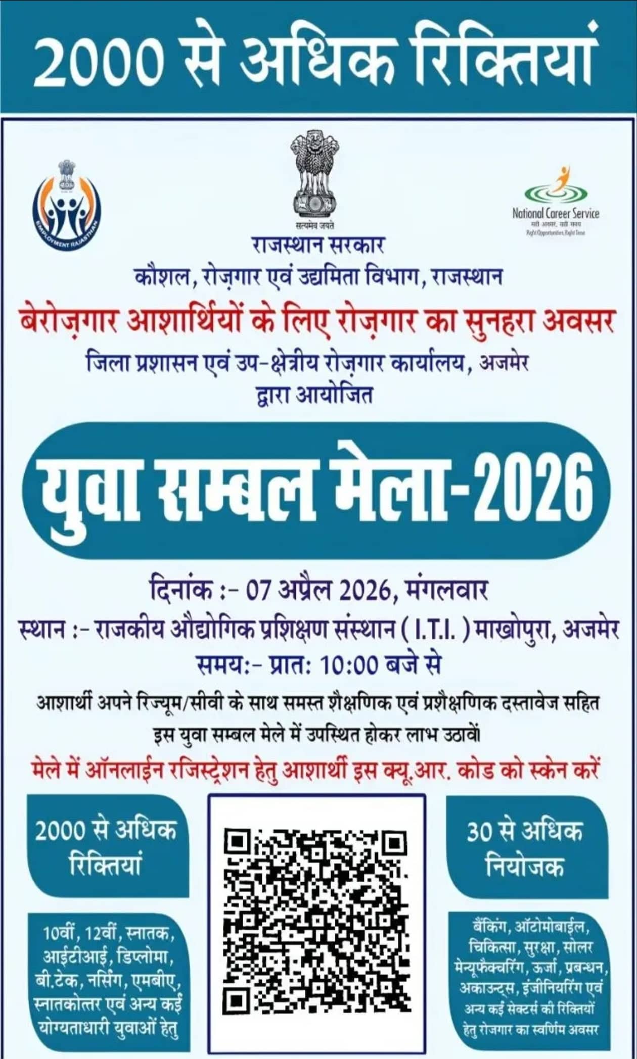 Yuva Sambhal Yojana 2026: राजस्थान सरकार के कौशल, रोजगार एवं उद्यमिता विभाग की ओर से राज्य के बेरोजगार युवाओं के लिए एक महत्वपूर्ण पहल की गई है। जिला प्रशासन एवं उप क्षेत्रीय रोजगार कार्यालय, अजमेर के सहयोग से युवा संबल मेला-2026 आयोजित किया जा रहा है, जिसका उद्देश्य प्रदेश के योग्य व प्रशिक्षित युवाओं को विभिन्न निजी और सरकारी संगठनों में रोजगार के अवसर उपलब्ध कराना है।